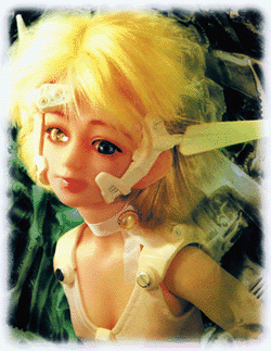 white spandex outfit and bootsblonde hair one mirrored eye and two medium blue eyes