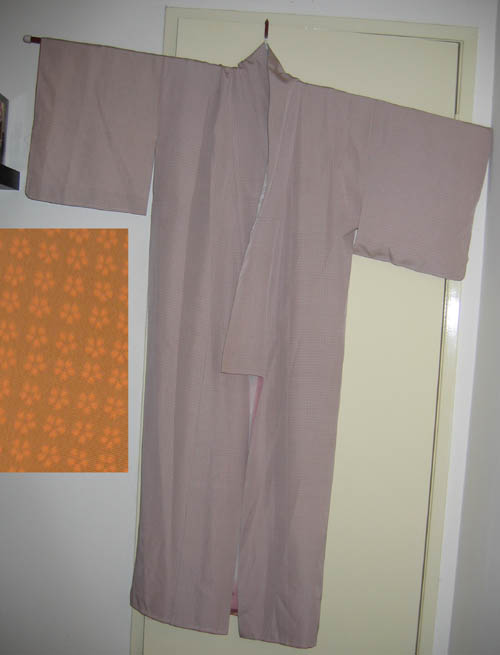 This was a gift from my friend Susan. The background is a medium grey, and the sakura flowers are a light pink. The inside of the kimono is white with a dusty rose dye around the edges.