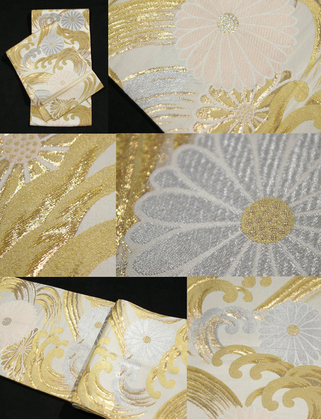 Glistening gold waves carry regal chrysanthemums woven in pink and silver across this ivory sash, creating an elegant scene. Condition: There is a yellow smudge around the middle of the obi and a center fold mark on a couple of places which is normal to used obi. Age Mid to late 20th c. Technique Weave |