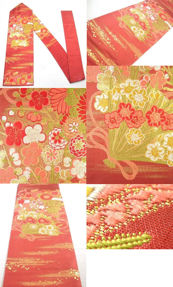 This nagoya obi has elegant flowers and fan motif, which is woven.