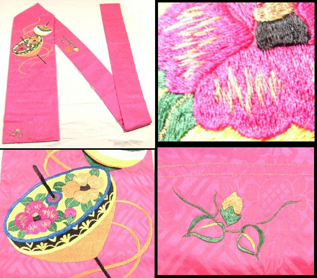 width 29.5cm 11 3/4" History: Vintage..... Condition: Very Good Technique: Embroidery This vintage nagoya obi has unique top and flowers motif, which are elaborately