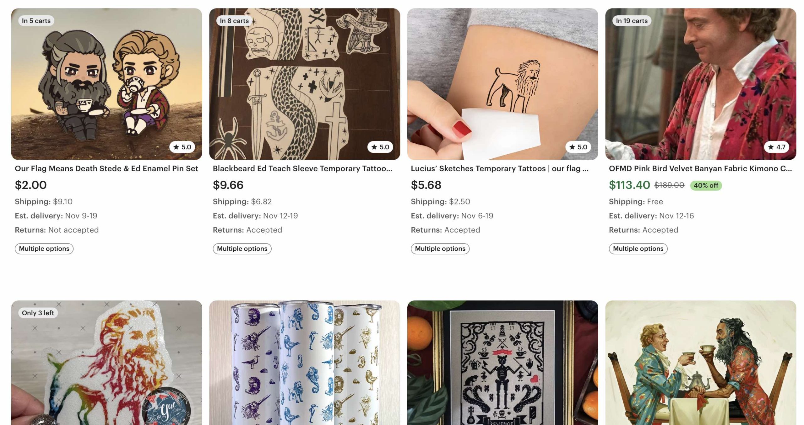 Here’s my personal list of Pirate and Our Flag Means Death related Etsy, small shops and Amazon affiliate recommendations! I get a very small kickback if you purchase on amazon but it costs you nothing. Some of these I have bought and loved myself and some are just well reviewed items that I think are have cool vibes. I do mark ones that I have bought but any items are of course, up to you and at your own risk! Enjoy, pirate crew!