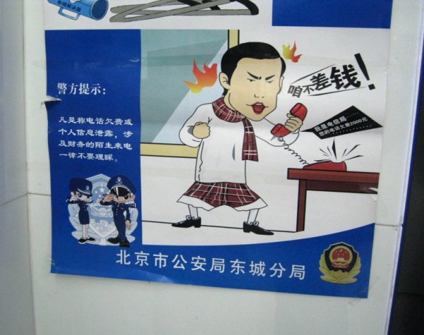 As far as my limited Chinese tells me, the sign near the ATM is a PSA from the East Beijing public welfare police department telling the public to ignore strangers posing as debt collectors in calls or texts to private telephone lines. The text from the fellow is “I don’t owe money!” while the bubble says “I’m from the telecommunications company, you still owe 2000 yuan on your telephone bill.”