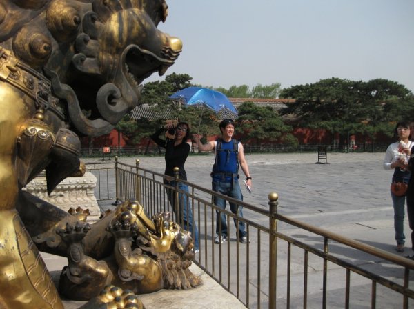 Marcus shielding AJ from the sun while she takes a picture of the foo dogs. 🙂