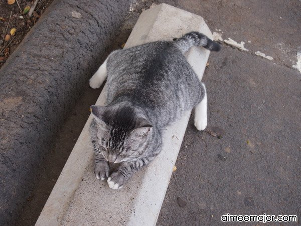 We saw this cat very intent on warming himself on this parking stop. If you tried to pet him, he’d go away, and then come right back to the same position.